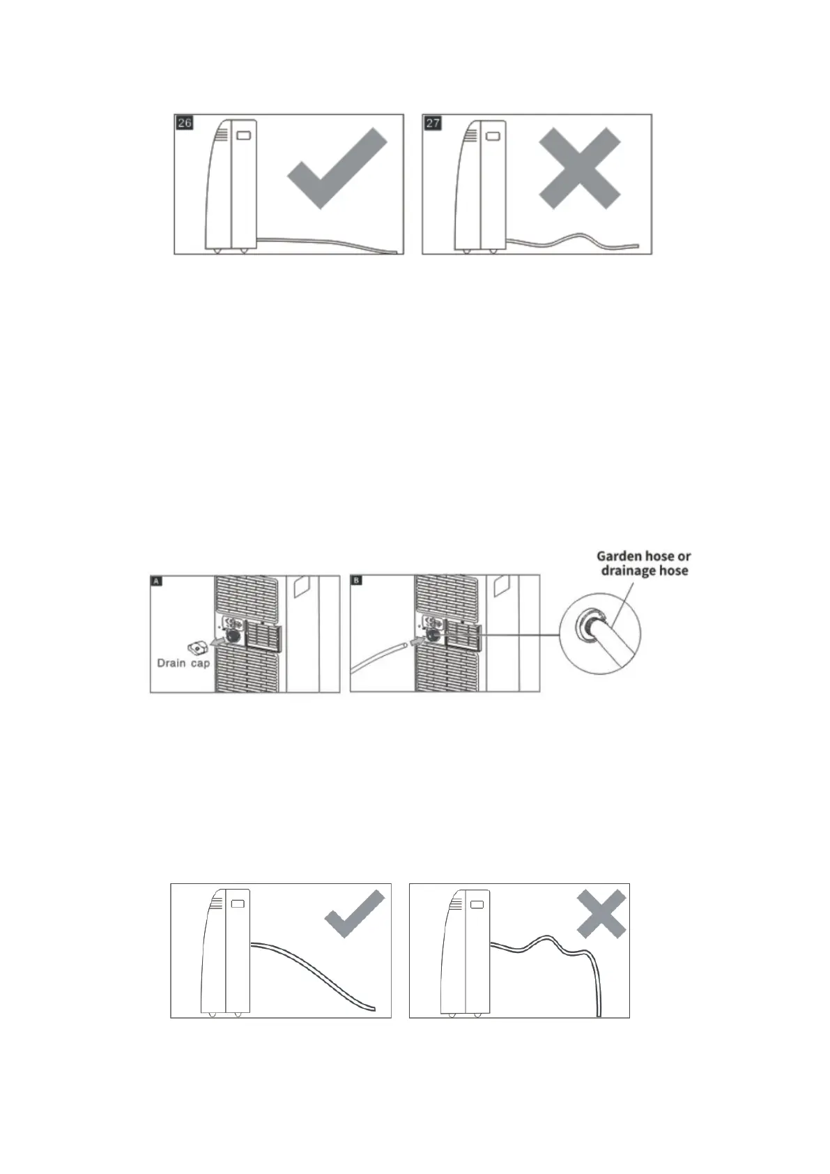 Please be sure that the height of and section of the drain hose should not be higher than