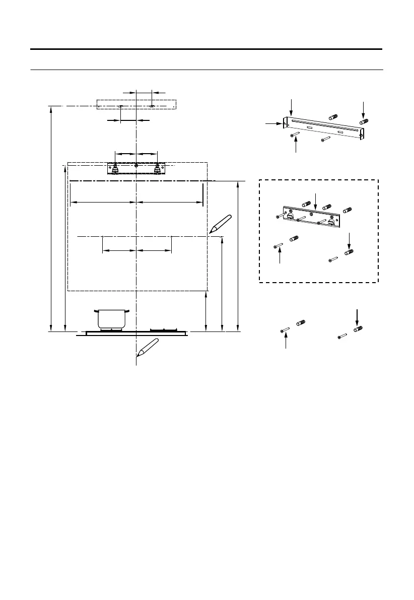 Marque un punto (2) en la línea horizontal B, 80 (135 opcional) mm a la derecha de la línea de
