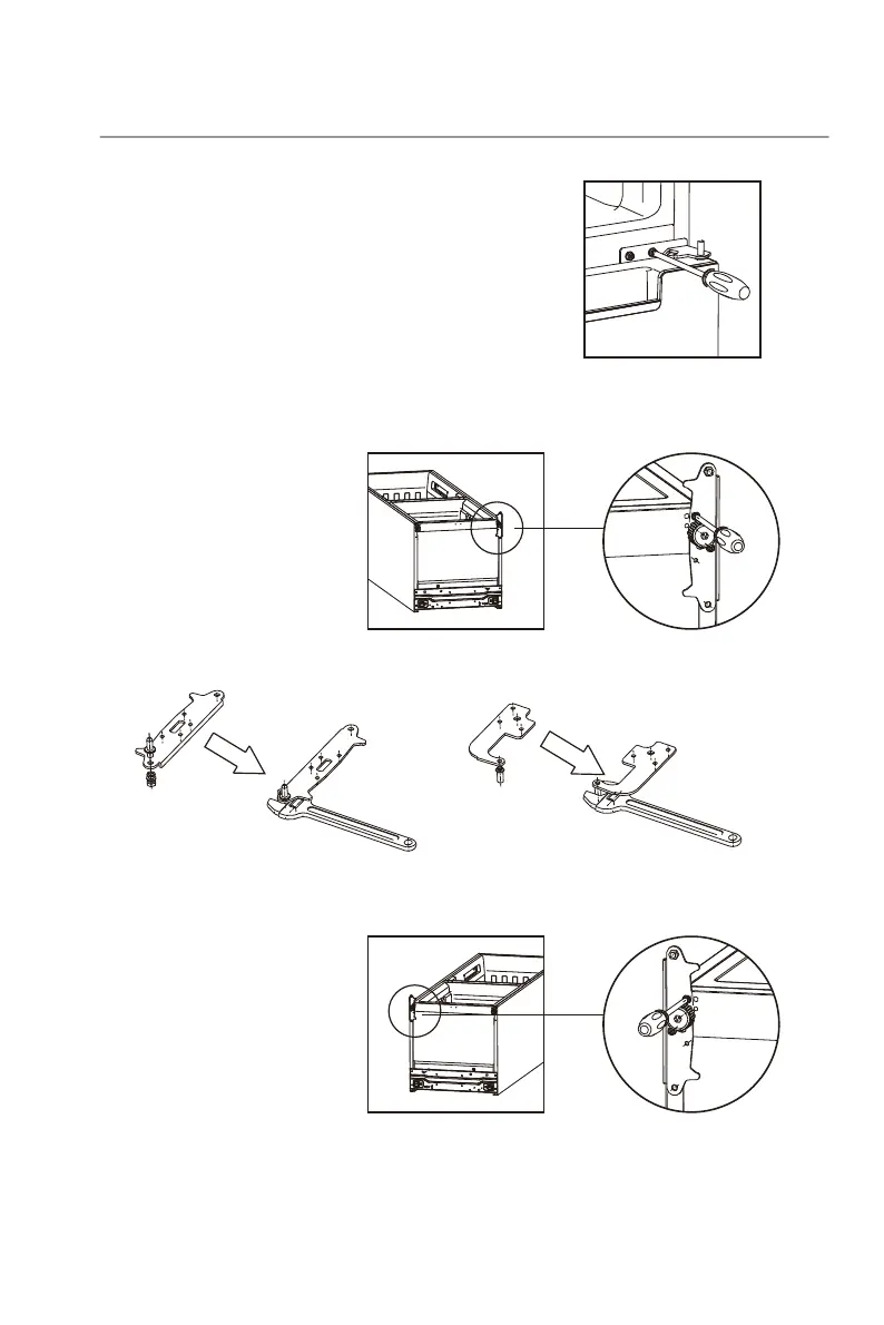 6. Install the lower hinge under to the refrigerator like below, screwing in the adjusting feet, make