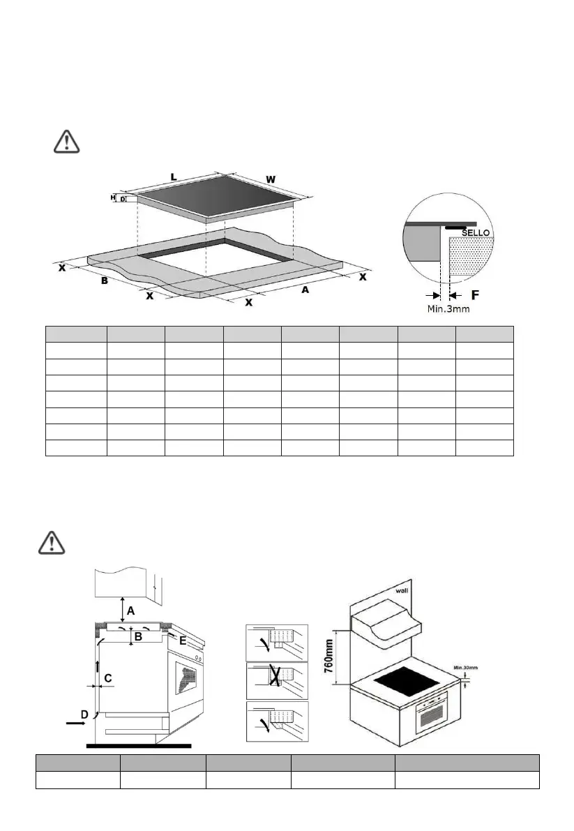 Nota: A distância de segurança entre a placa e o armário por cima da placa deve ser
