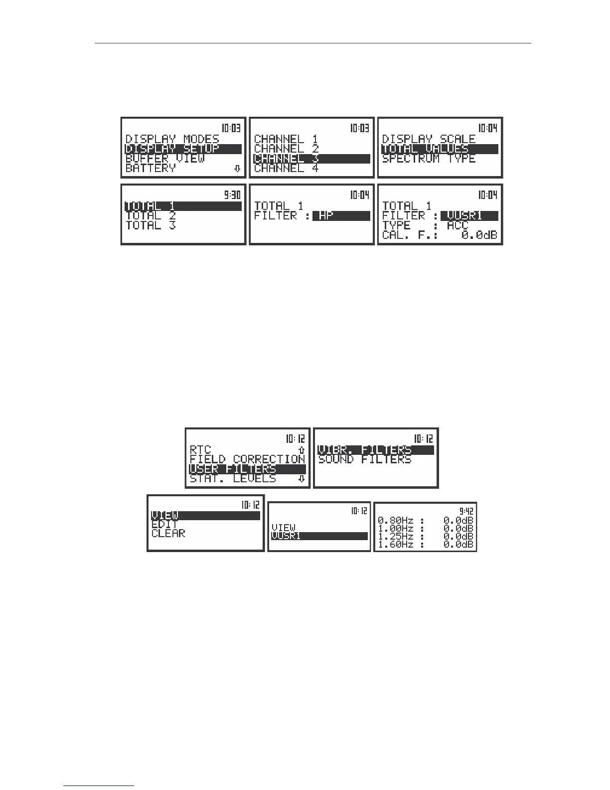 (path: MENU / SETUP / USER FILTERS / VIBR. FILTERS). It is also possible to send the coefficients of the