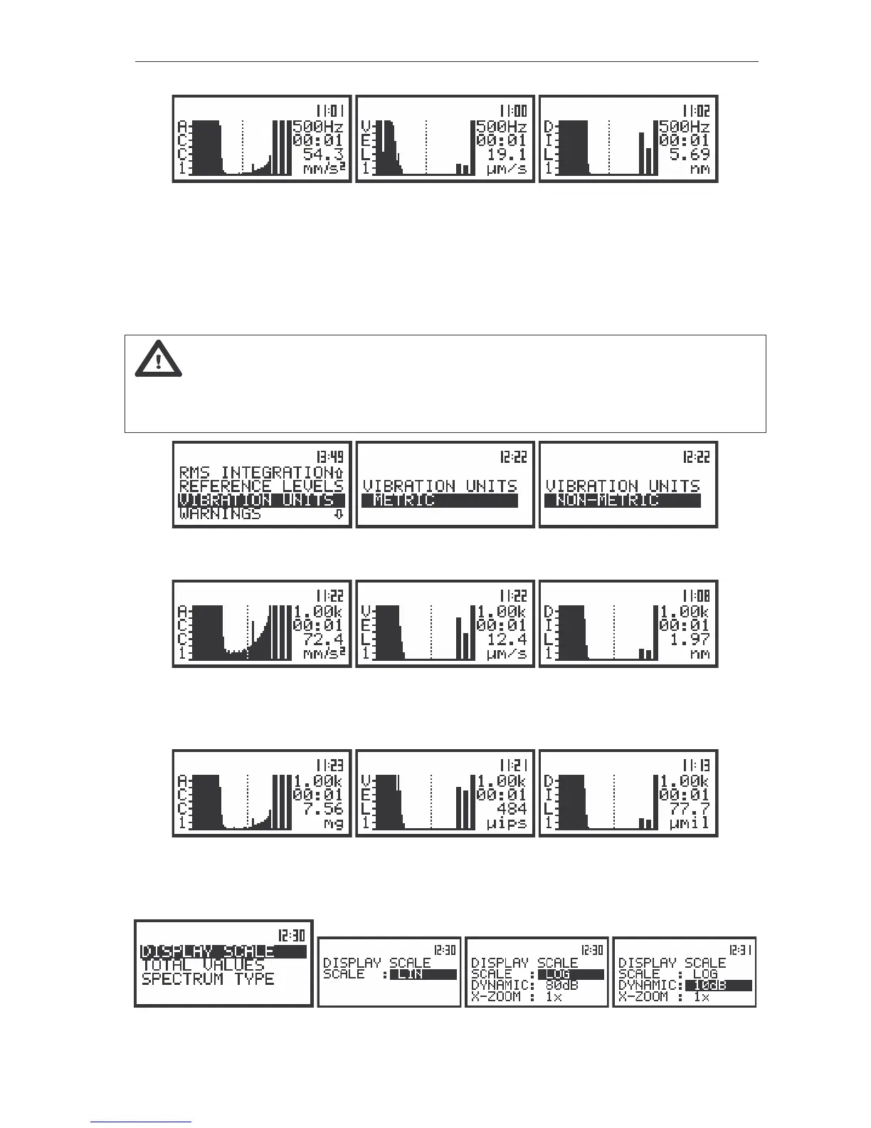 the different settings made in the VIBRATION UNITS (METRIC or NON-METRIC), the VIBR.SCALE