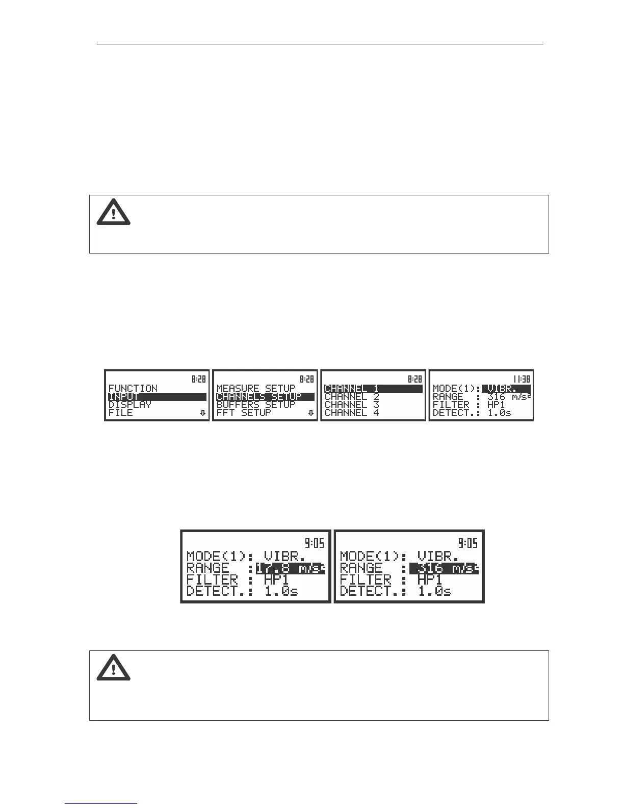It is possible to change RANGE in VIBRATION mode. The instrument operates in two input ranges