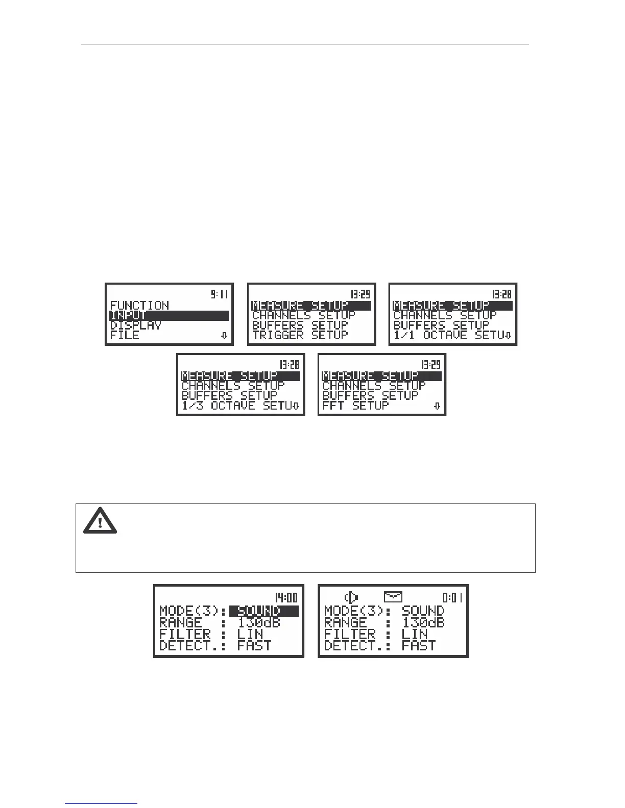 • the 1/1 OCTAVE SETUP, 1/3 OCTAVE SETUP or FFT SETUP function for 1/1 OCTAVE,