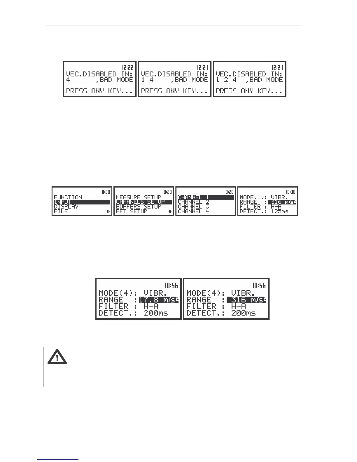 In the case of vibration signal the instrument operates in two input ranges 17.8 m/s
