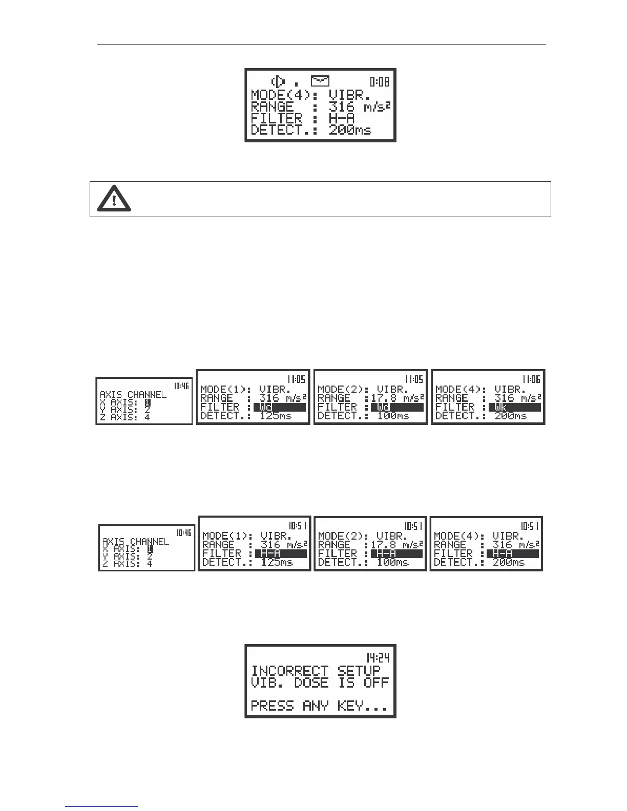 If the user selects wrong FILTER, the text: INCORRECT SETUP, VIB. DOSE IS OFF appears on