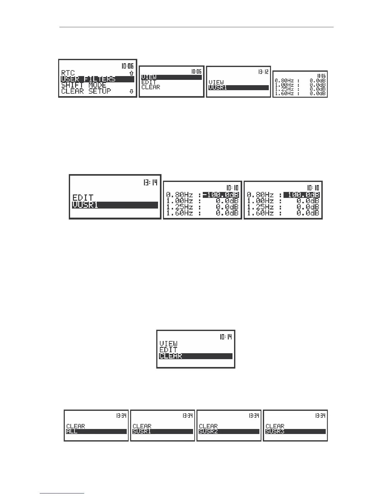 octave filters. It is possible to clear all sets of coefficients (ALL), to clear the first set (VUSR1), to clear the