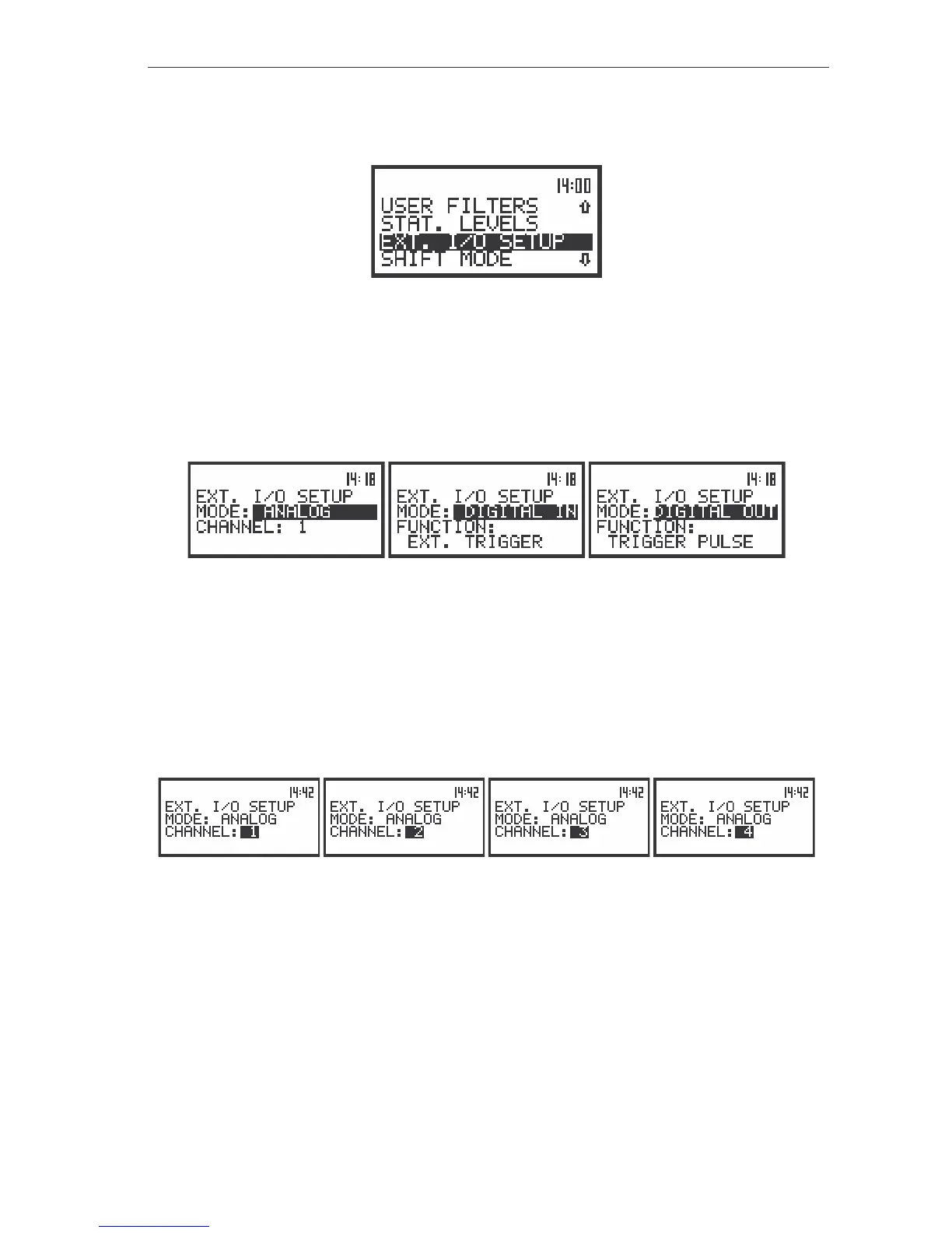 In the MODE position of EXT. I/O SETUP sub-list three options are available: ANALOG,