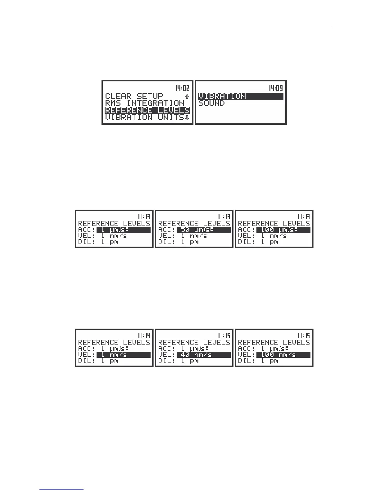 The display’s view in the REFERENCE LEVEL sub-list; the reference level setting of acceleration signal