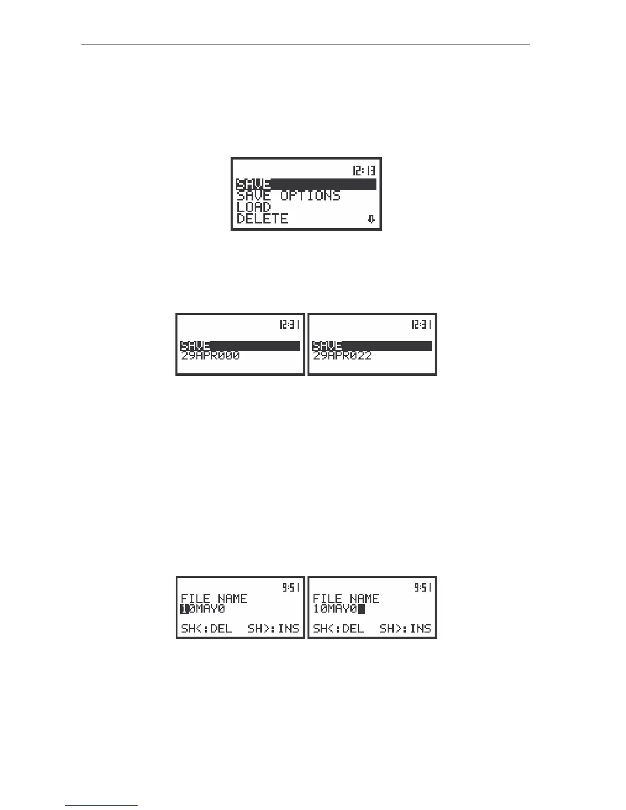 displayed under the SAVE or SAVE NEXT text. The default name for a file is displayed in the case of the