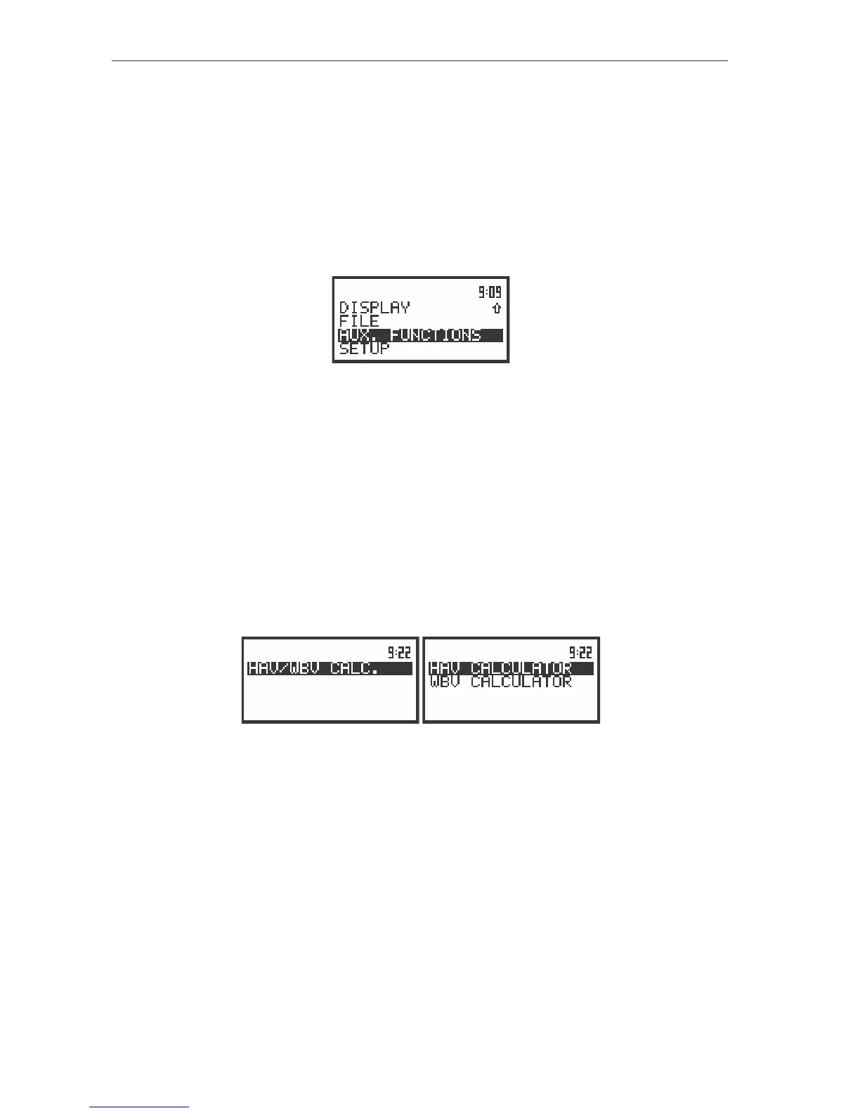 position: HAV/WBV CALC. The HAV/WBV CALCULATOR (path: MENU / AUX. FUNCTIONS / HAV/WBV