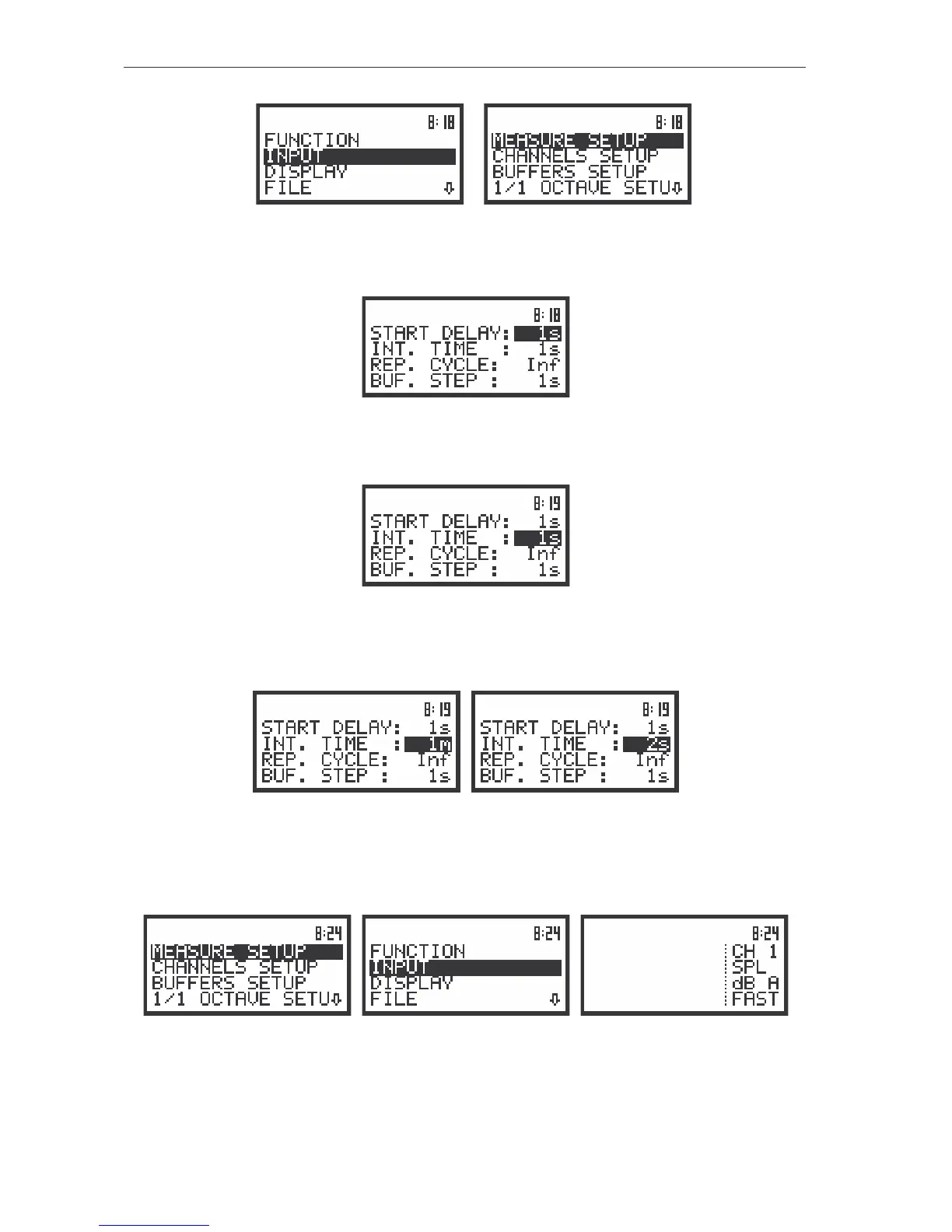 The display with the opened MEASURE SETUP sub-list; the INT.TIME position accessible