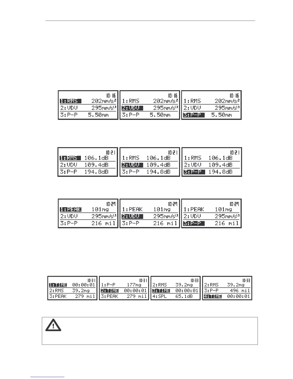 measured in parallel (see Appendix D for the definitions): PEAK, P–P, MTVV (or MAX), RMS, VDV,