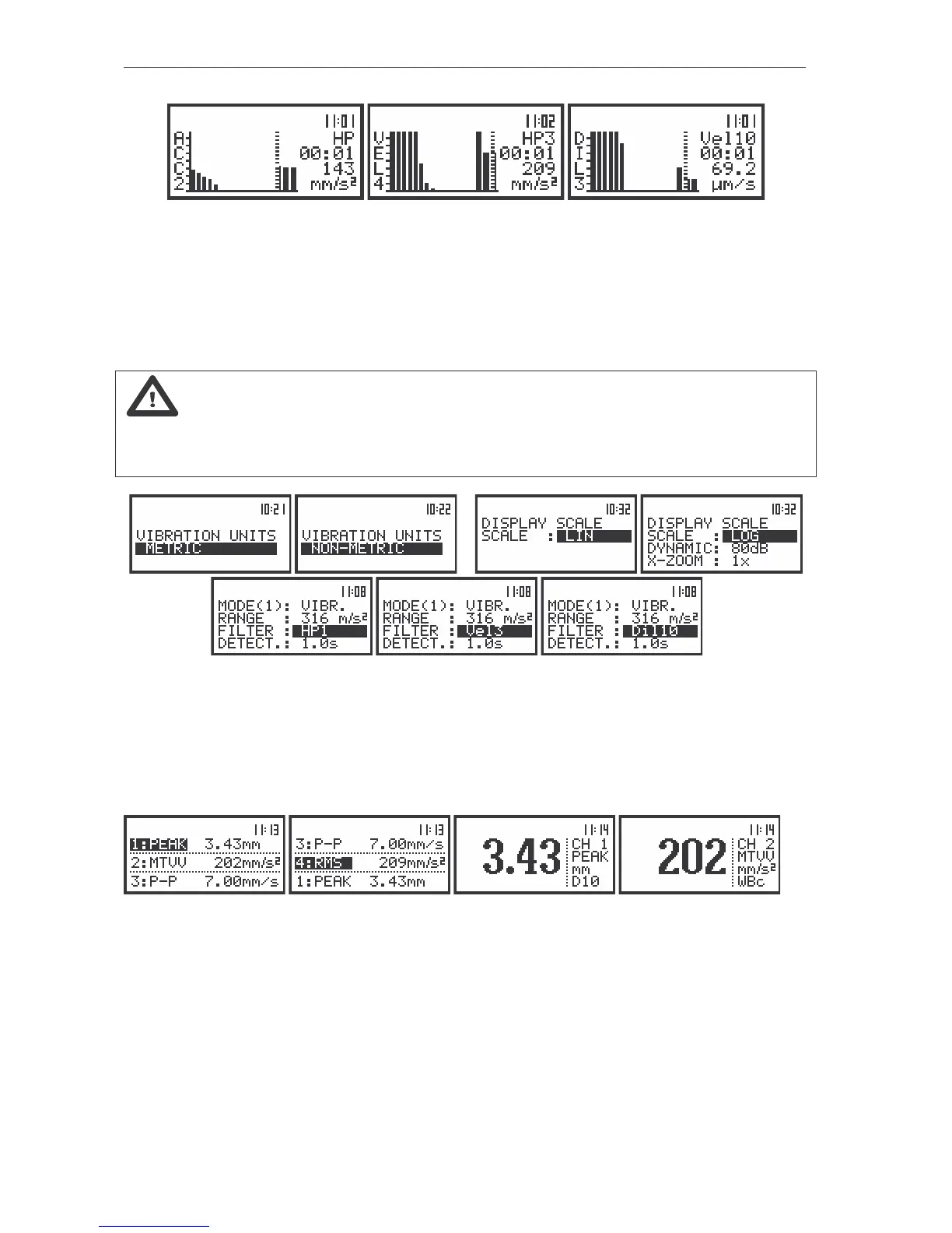 the different settings made in the VIBRATION UNITS (METRIC or NON-METRIC), the SCALE position of