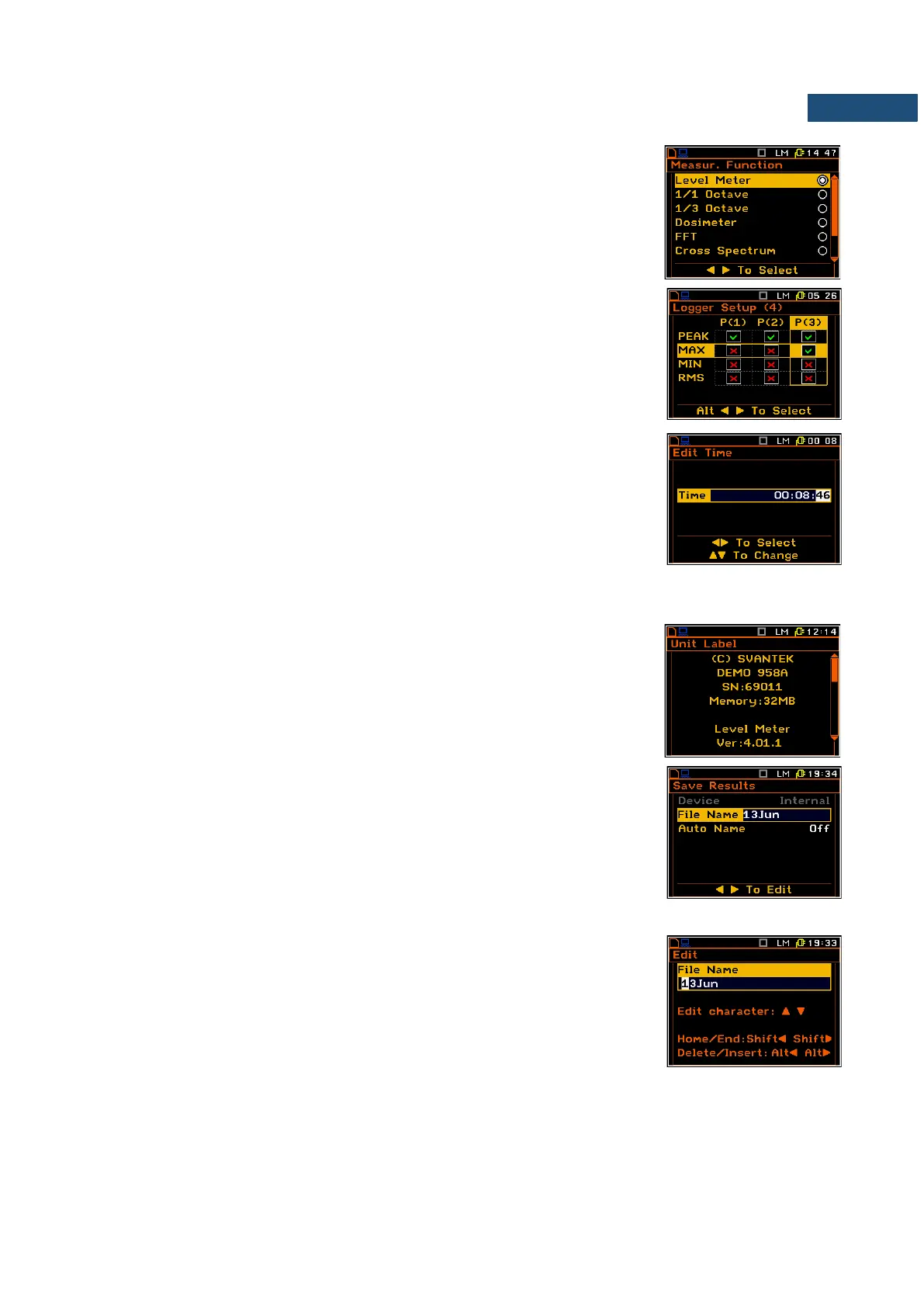 Some screens inform about the state of the instrument, available memory,