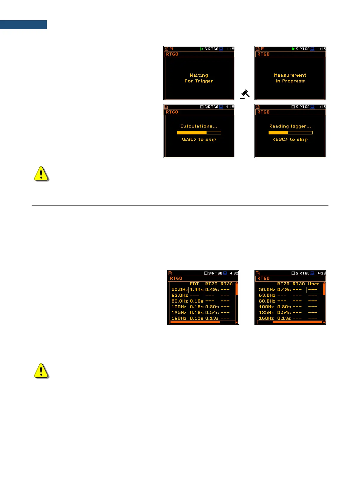 The RT60 measurement results for all 1/1 or 1/3-octave bands and three Total values can be viewed in three