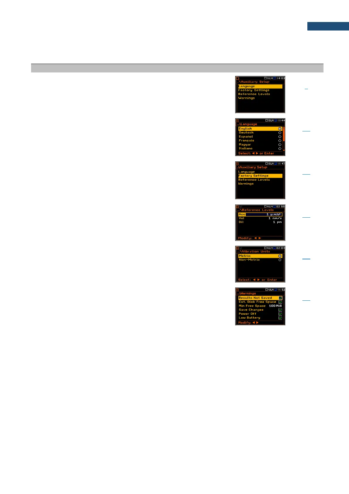 screens: Language, Factory Settings, Reference Levels,
