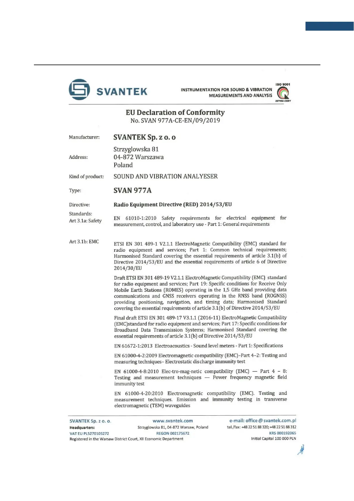 Svantek SVAN 977A - Declaration of Conformity