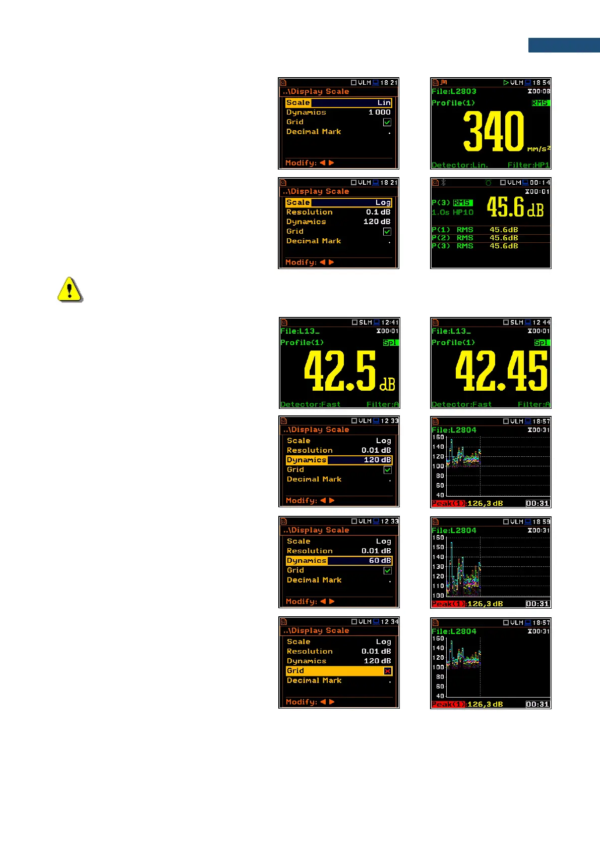 Note: In Vibration modes, parameters can be presented in Logarithmic (dB) or Linear (for example,