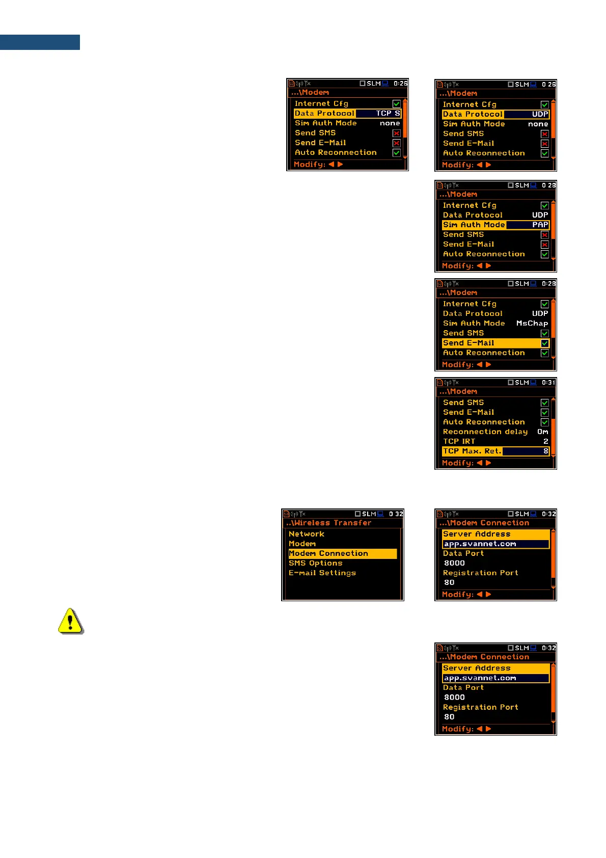Note: For connection with the SvanNET server the parameters in the Modem Connection list should