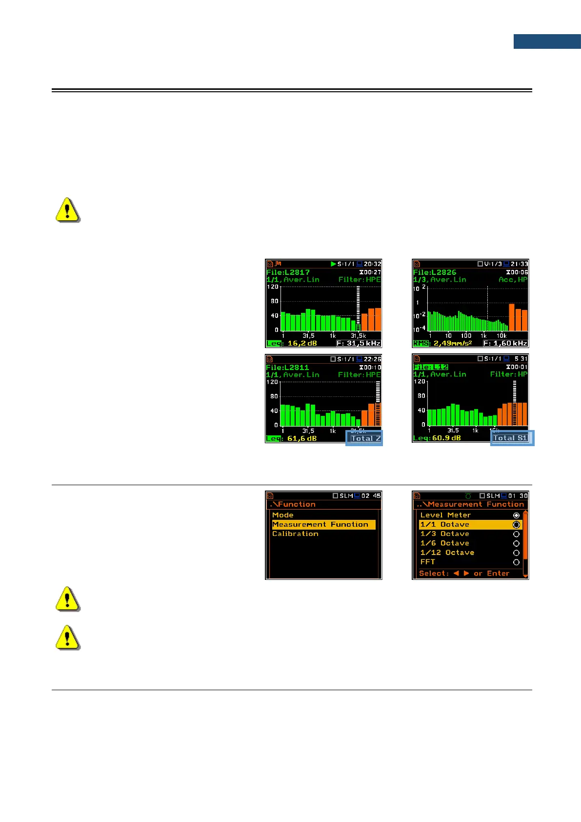 Note: TOTAL RMS (LEQ) results are measured with their own weighting filters (A, C, Z or S1, S2,