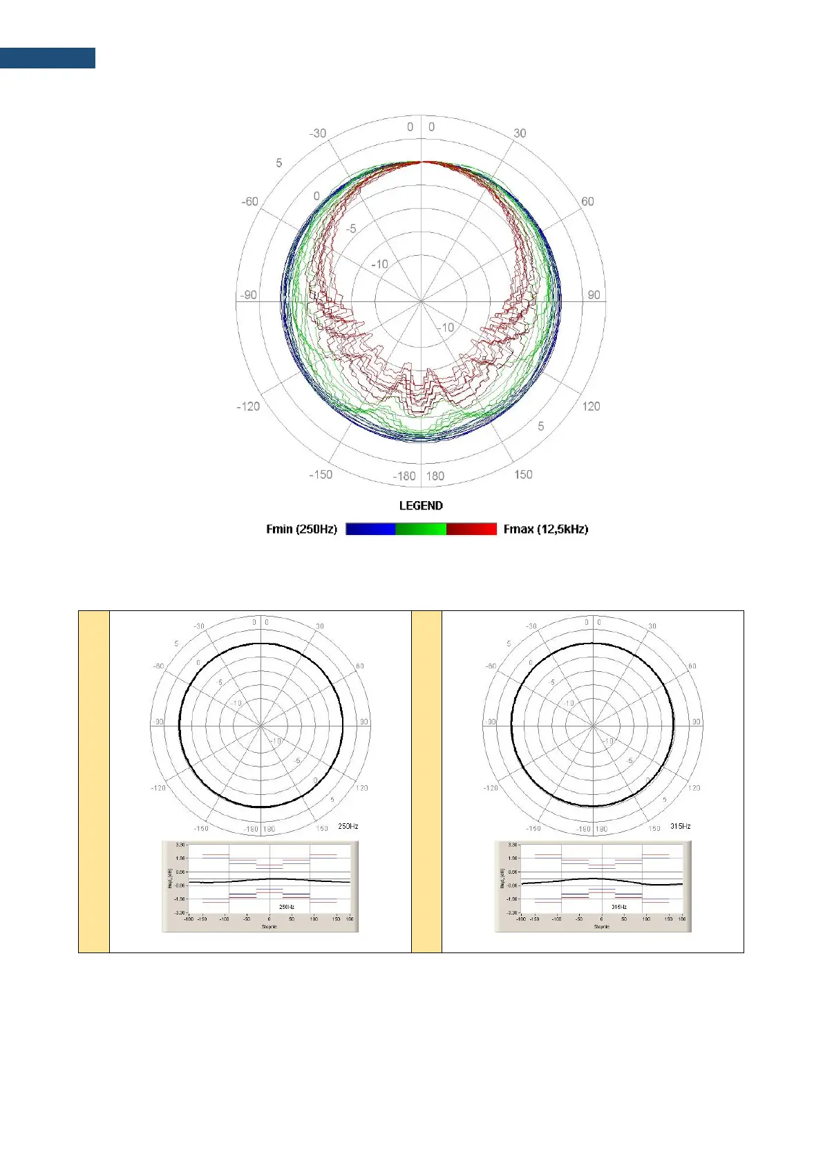 The round charts show the directional characteristic and the charts below shows the errors for angles.