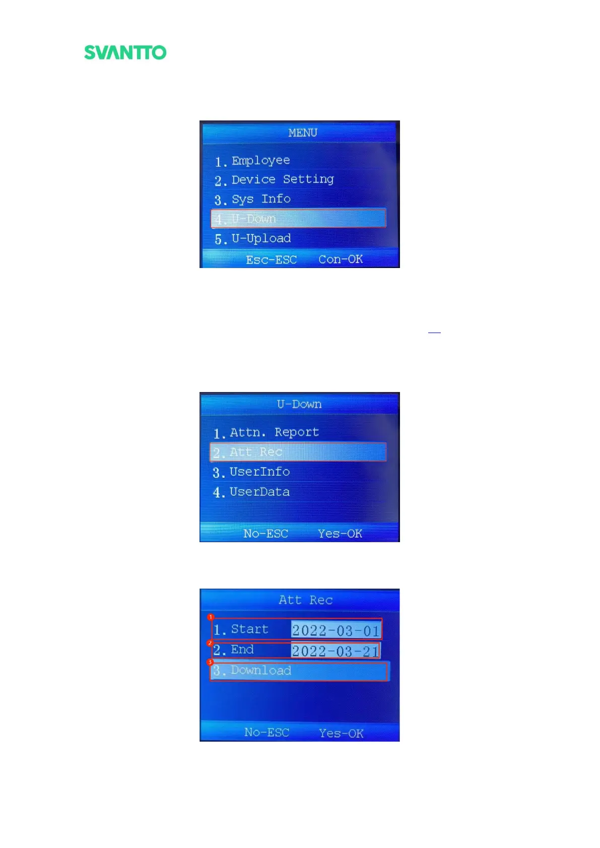 2) Choosing the start and end data, then select [Download] and press [OK] key to download punch record