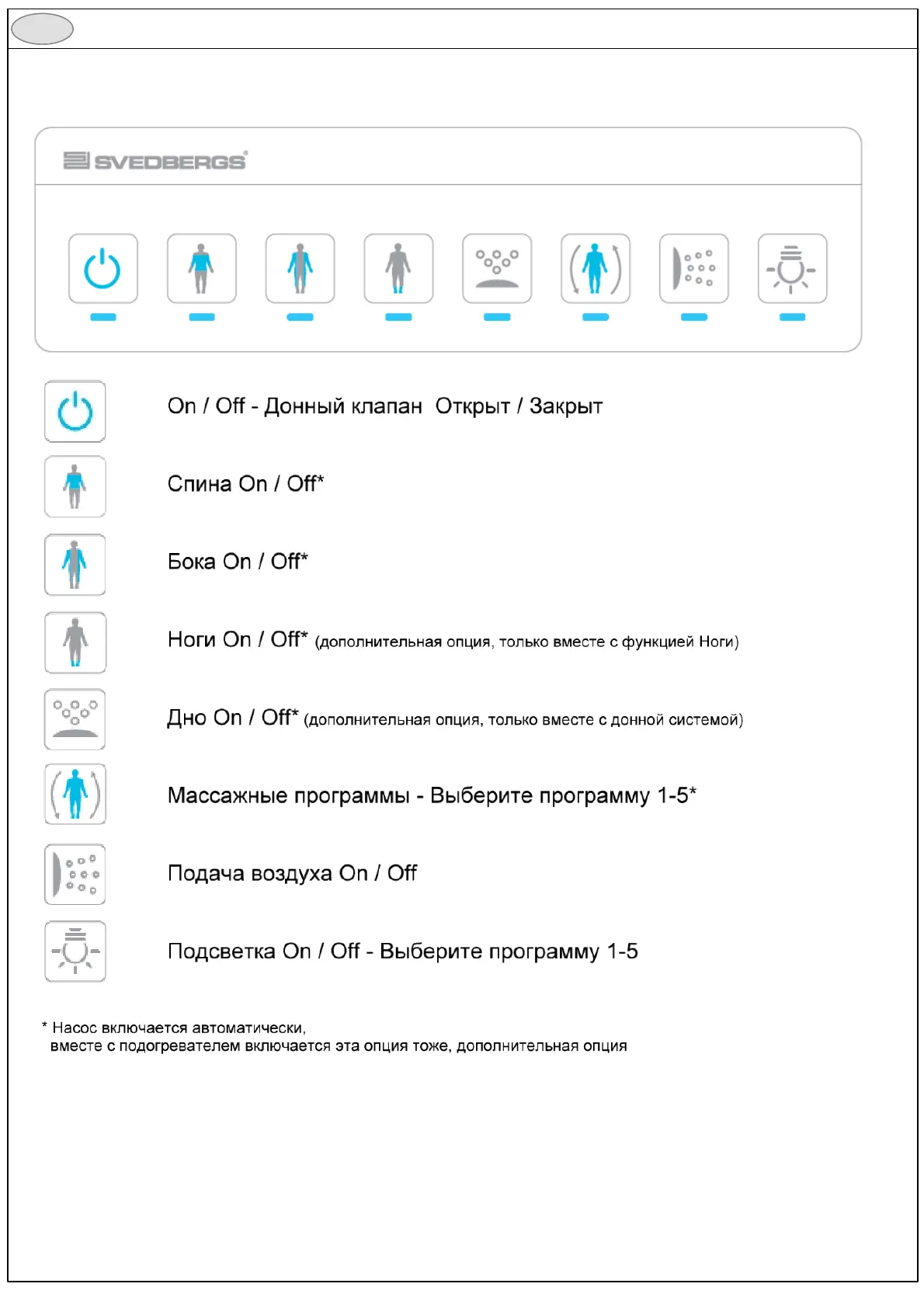 При помощи сенсорной панели ведется управление насосом, светотерапией и струями смеси воды и воздуха из