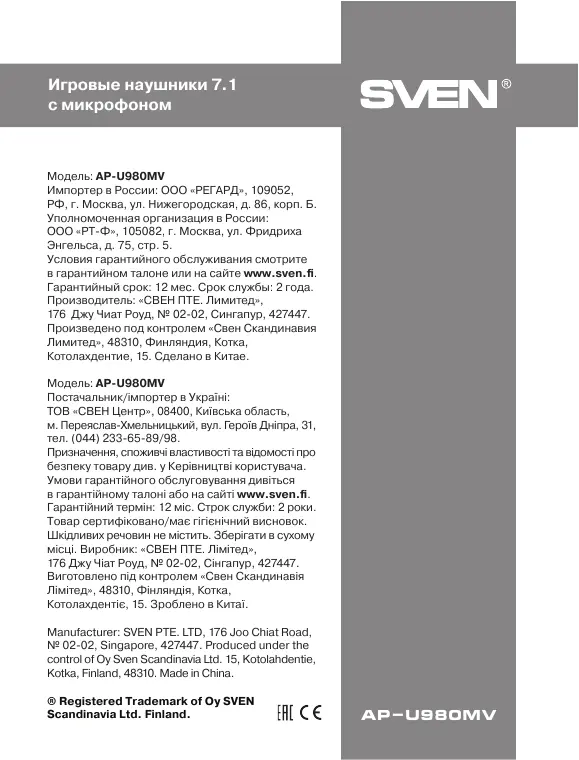 в гарантийном талоне или на сайте www.sven.fi.