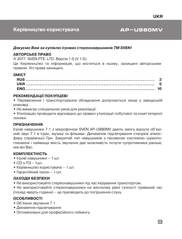 © 2017. SVEN PTE. LTD. Версія 1.0 (V 1.0).