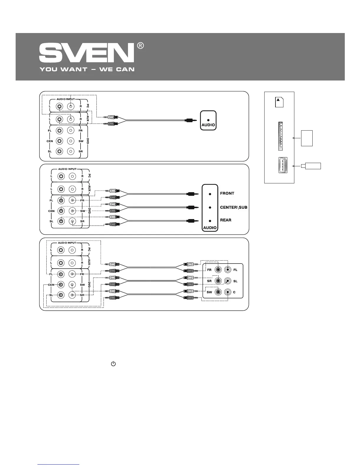 USB/SD a, PC b, FM n, AUX p, 2.1/5.1 q, DVD r on the RC (Fig. 4). The subwoofer LED