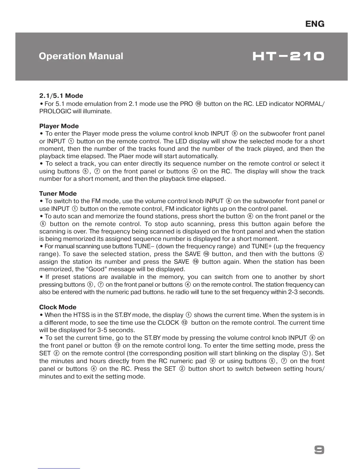 • For 5.1 mode emulation from 2.1 mode use the PRO j button on the RC. LED indicator NORMAL/