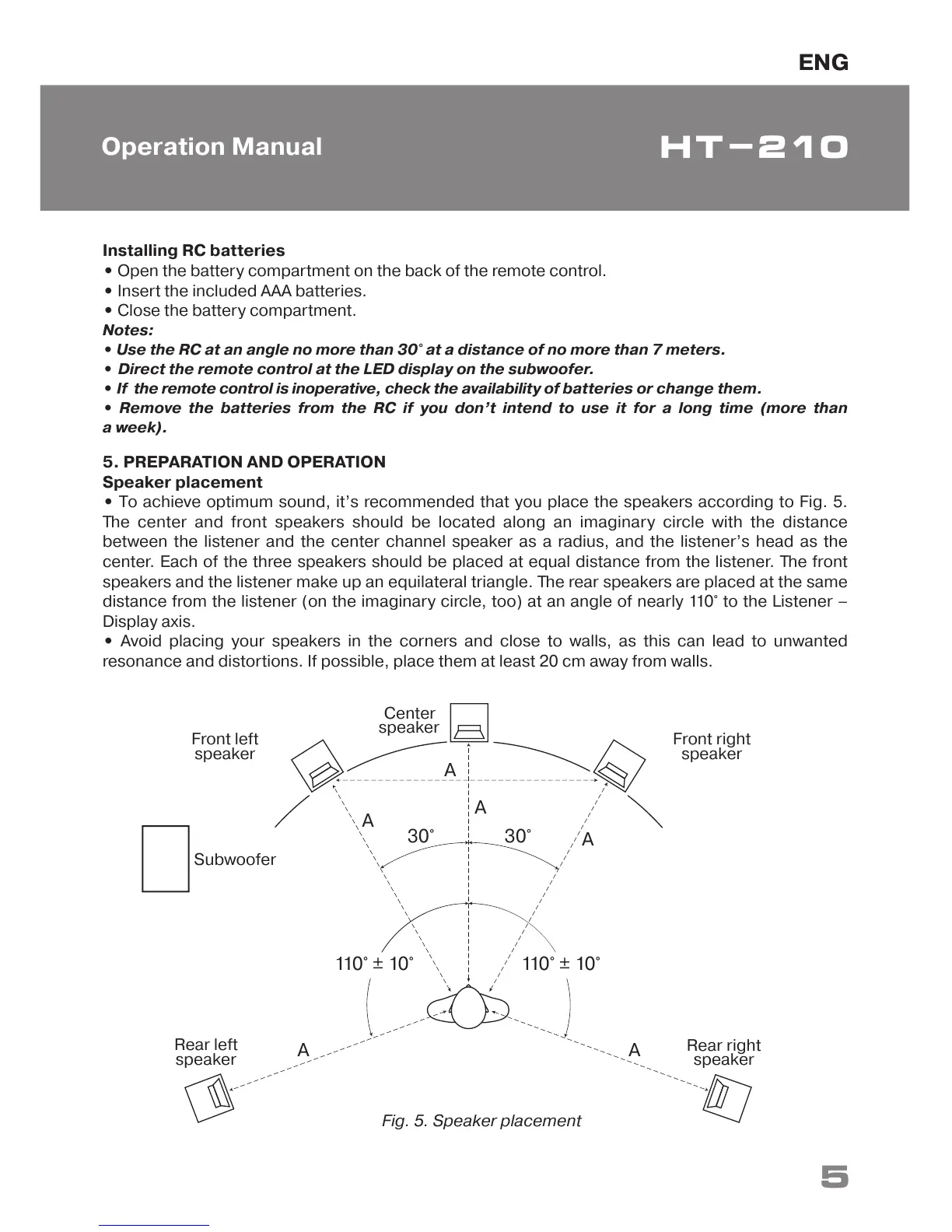 • To achieve optimum sound, it’s recommended that you place the speakers according to Fig. 5.