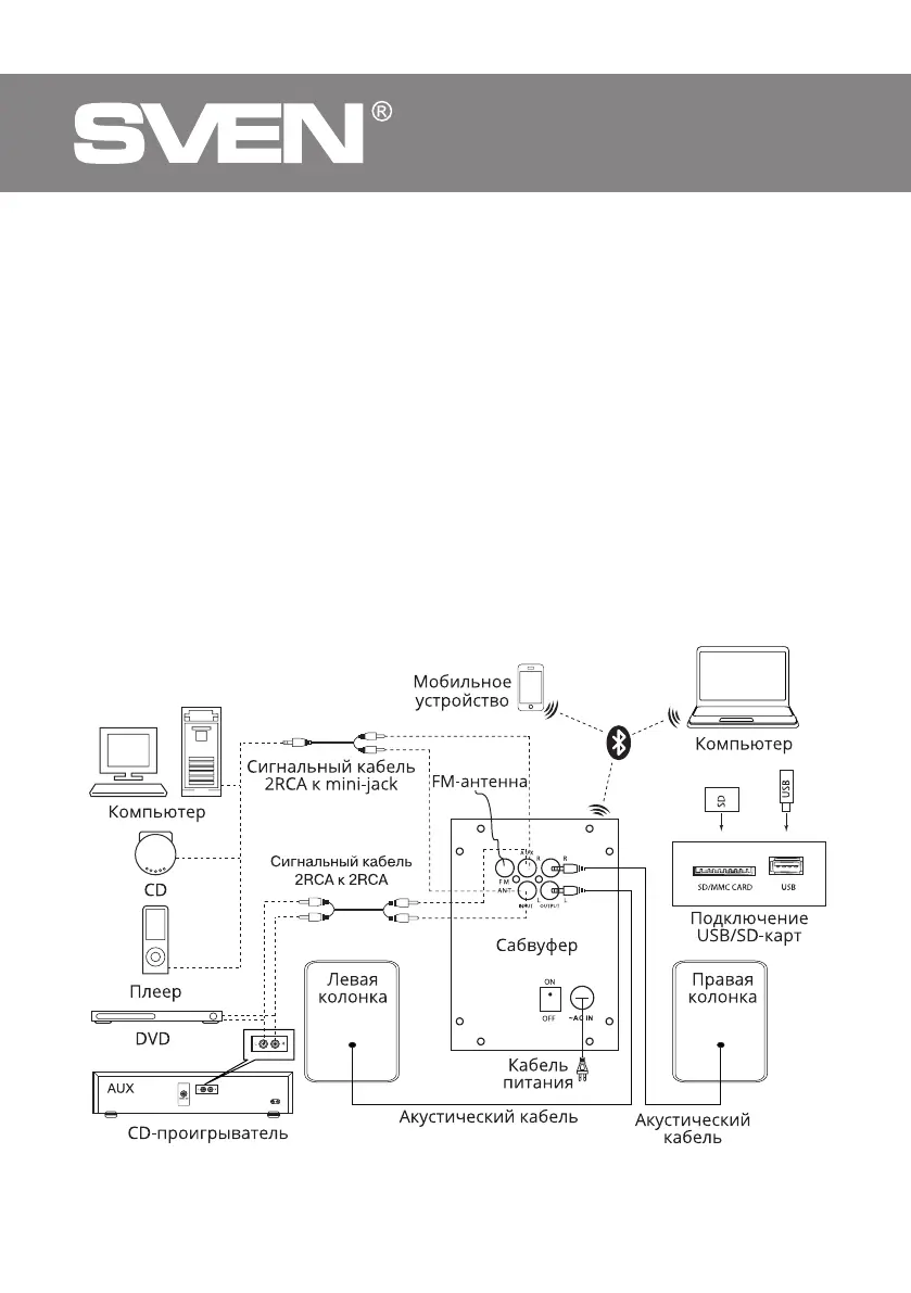 • Для подключения АС к ТВ, звуковой карте ПК и мобильным устройствам сначала под-