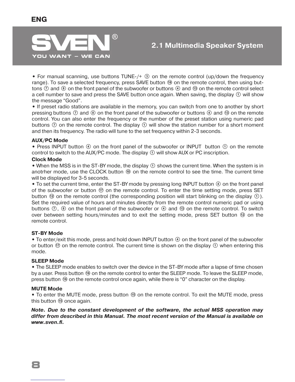 control to switch to the AUX/PC mode. The display a will show AUX or PC inscription.