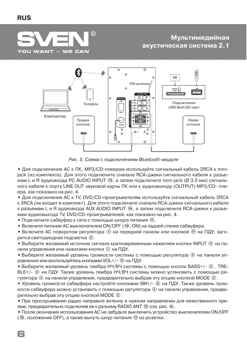 • Для подключения АС к ПК, МР3/CD-плеерам используйте сигнальный кабель 2RCA к mini-