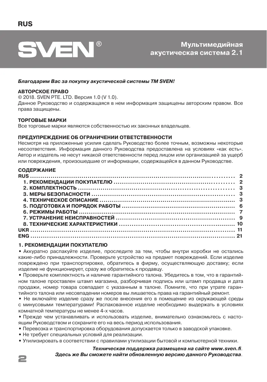 © 2018. SVEN PTE. LTD. Версия 1.0 (V 1.0).
