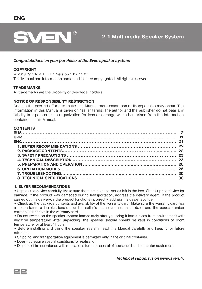 Congratulations on your purchase of the Sven speaker system!