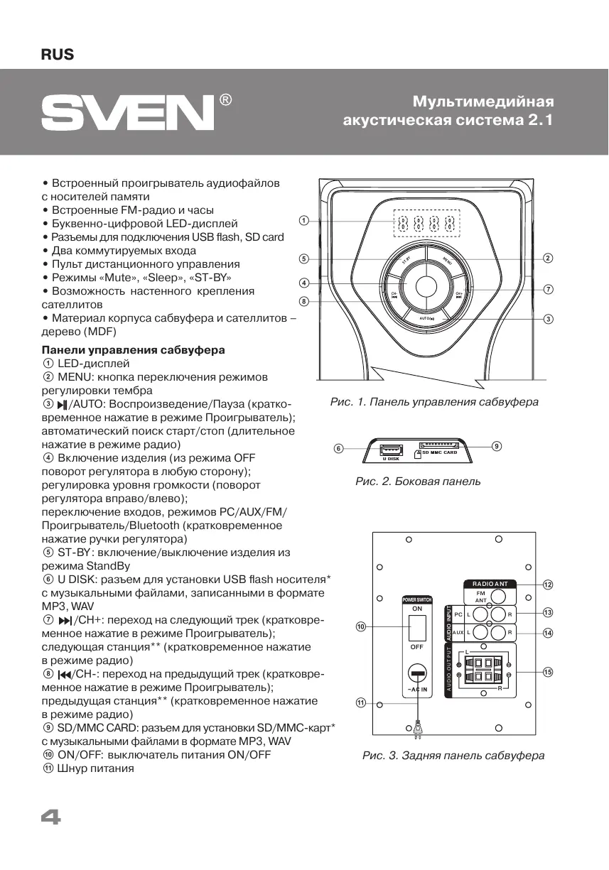 переключение входов, режимов PC/AUX/FM/