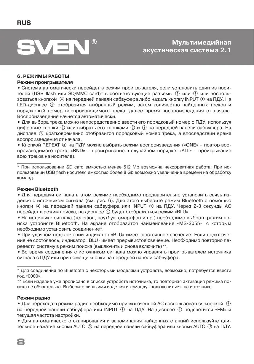 * При использовании SD card емкостью менее 512 Mb возможна некорректная работа. При ис-