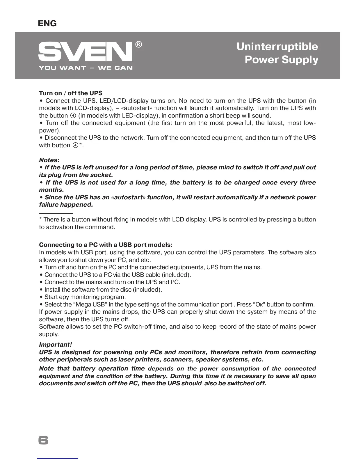 models with LCD-display), – «autostart» function will launch it automatically. Turn on the UPS with