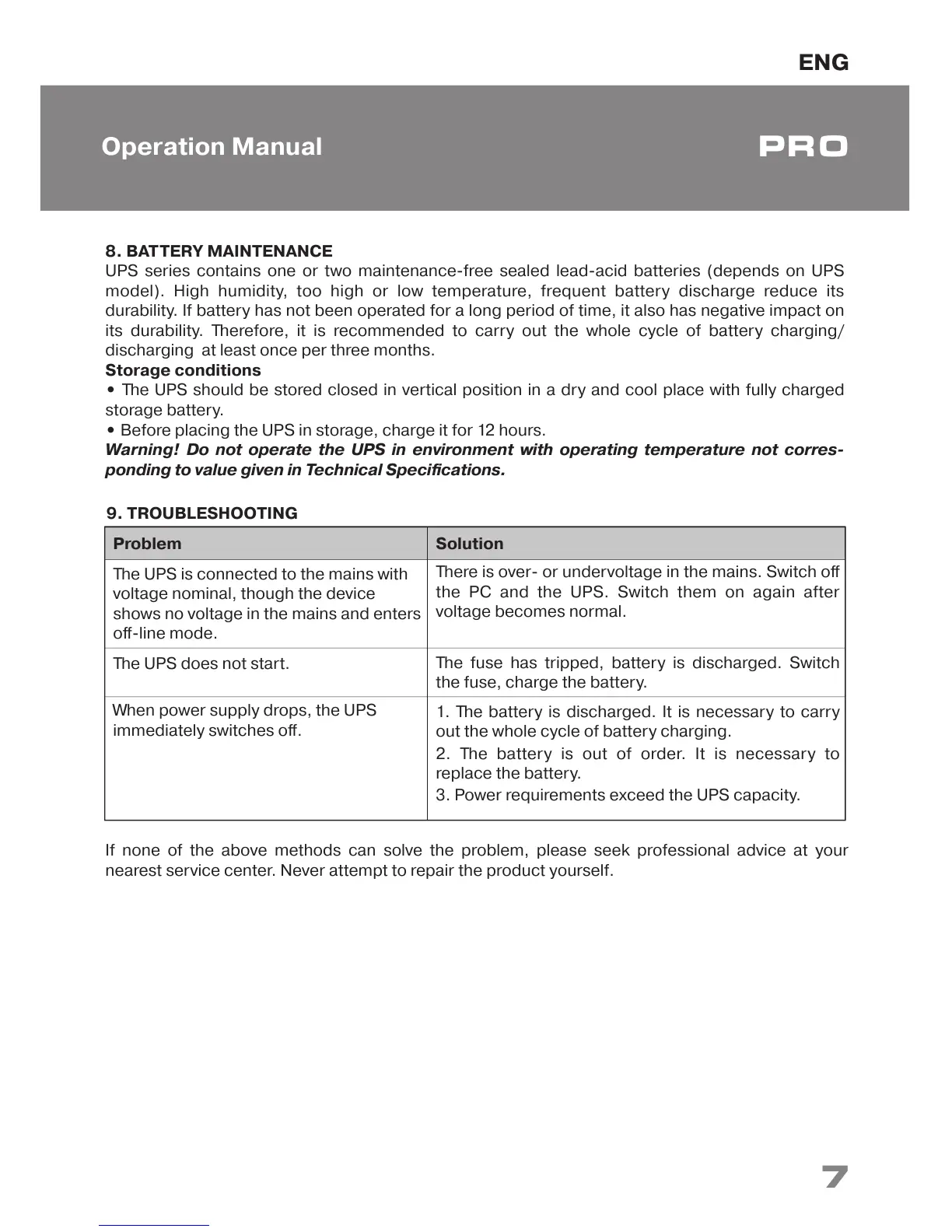 UPS series contains one or two maintenance-free sealed lead-acid batteries (depends on UPS