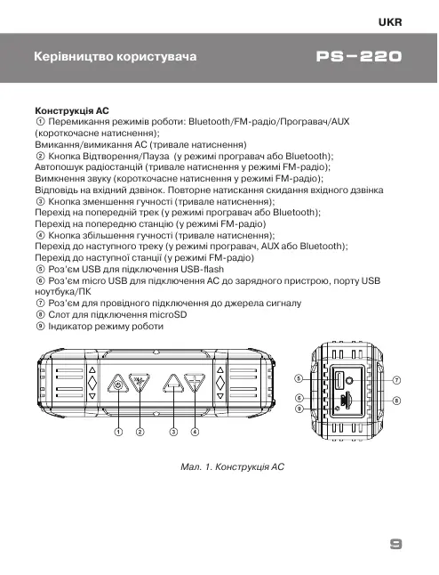 a Перемикання режимів роботи: Bluetooth/FM-радіо/Програвач/AUX