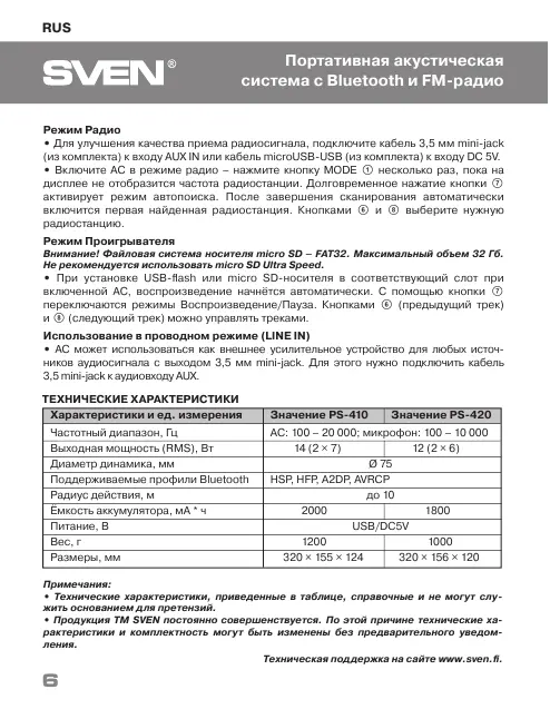 • Продукция ТМ SVEN постоянно совершенствуется. По этой причине технические ха-