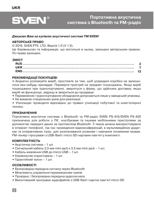 © 2019. SVEN PTE. LTD. Версія 1.0 (V 1.0).