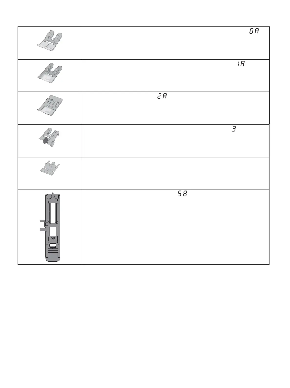 Important: Make sure that the Integrated Even Feed System is disengaged when using presser foot 2A, 5B.