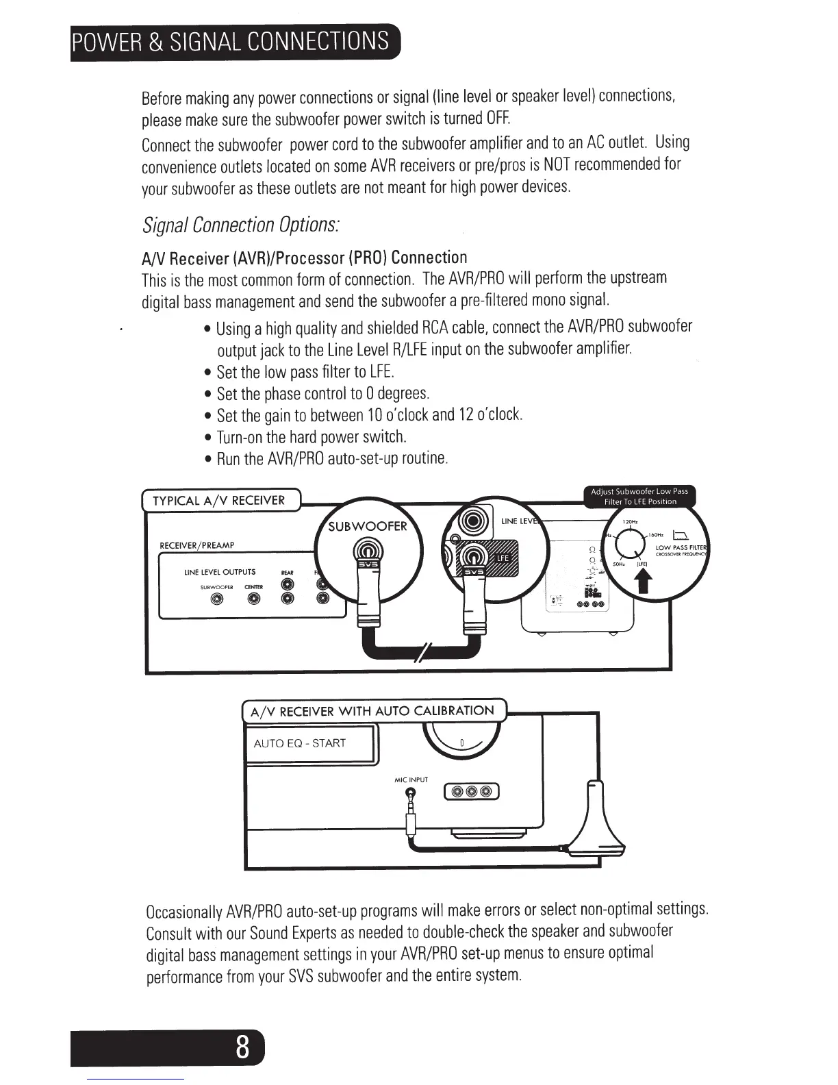 SVS SB-1000 - Power & Signal Connections; A;V Receiver (AVR);Processor (PRO) Connection