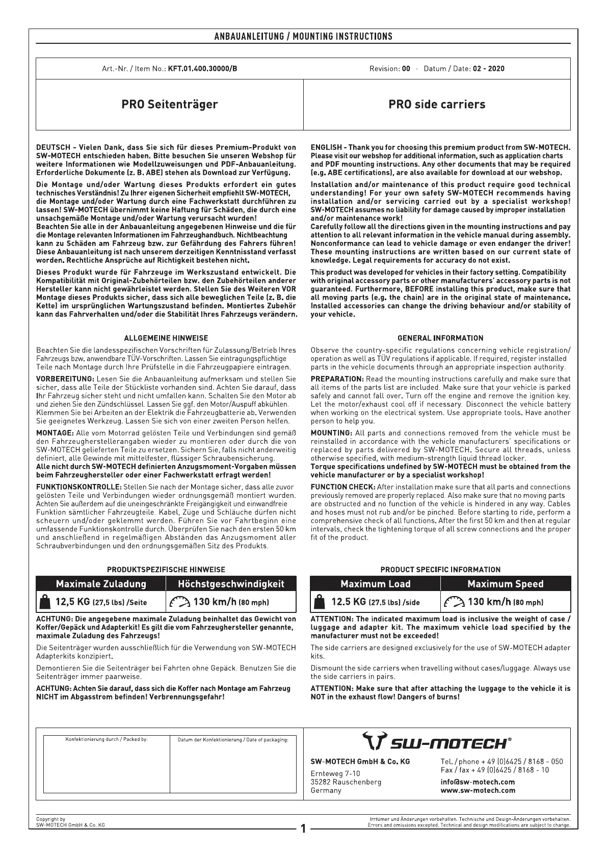 SW-Motech Pro Series - PRO Side Carriers Mounting Instructions; PRO Side Carriers: General Information; PRO Side Carriers: Product Specific Information