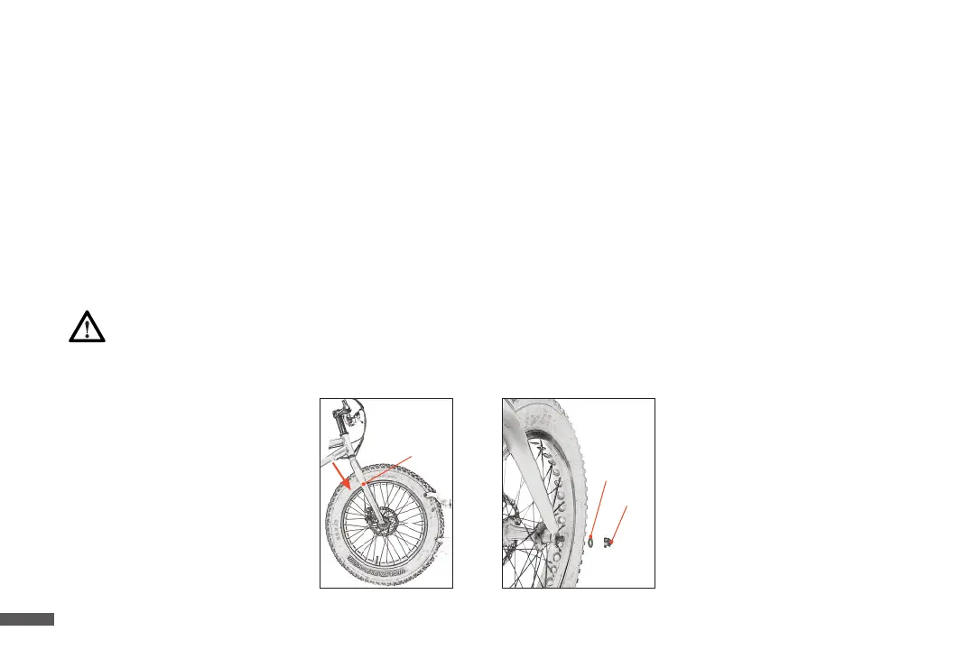 Step 2. Pick up your e-bike, line up the fork with the axle at the center of the wheel, and fi t the two