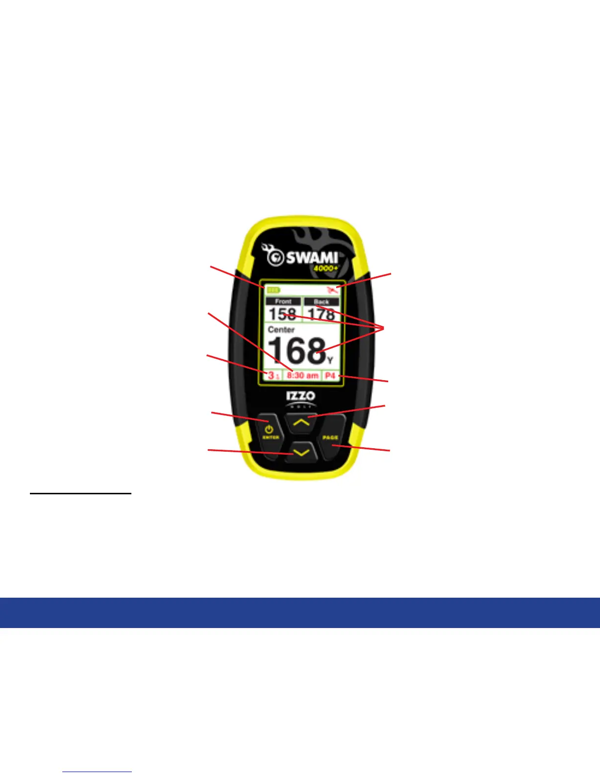 • Page Key: Press to toggle between distances to Green or Hazards in Play Mode